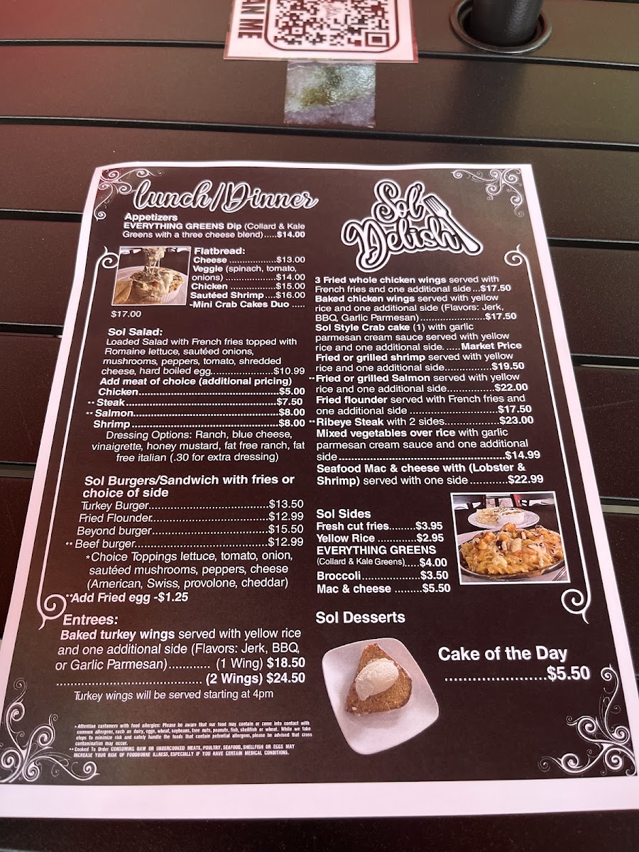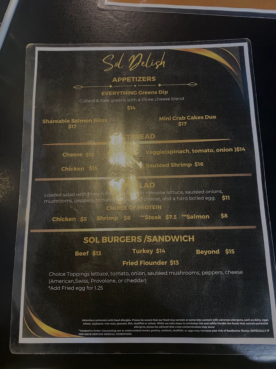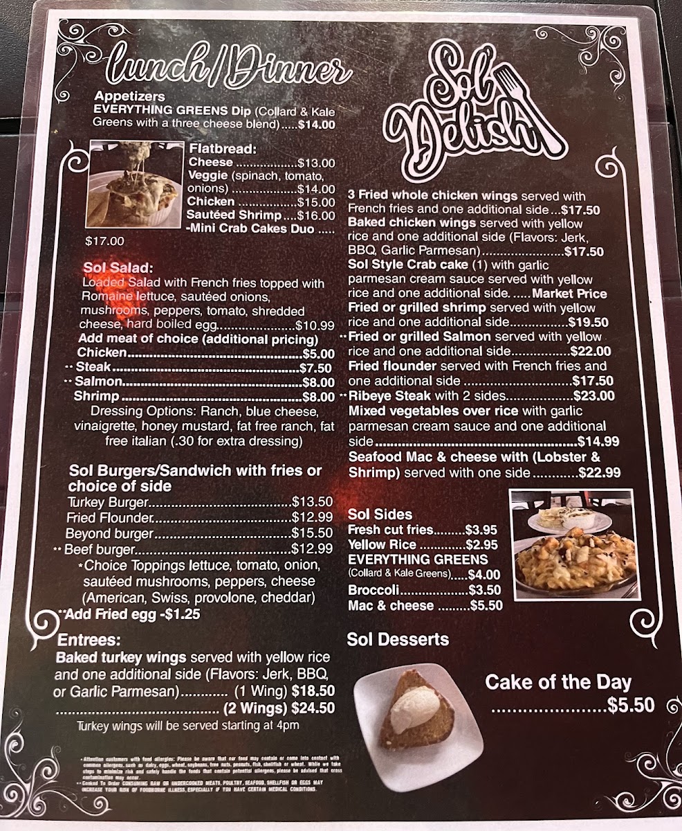 Introducing the menu of Sol'Delish CLT Restaurant, a vibrant eatery located in the heart of Charlotte, NC. This culinary gem is celebrated for its warm atmosphere and exceptional service. Patrons rave about the flavorful dishes, with highlights including the mouthwatering fried flounder, succulent fried chicken, and delectable seafood mac & cheese. The menu is a delightful showcase of Southern comfort food, complete with sides like collard greens and yams that pair perfectly with the mains.